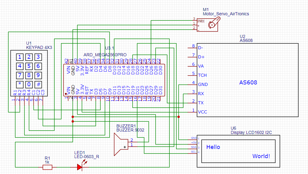 The components used in this project include: an Arduino Mega Pro Mini, an AS608 Fingerprint Scanner Module, an I2C LCD Display, a 4×3 Keypad, a Servo Motor, a Buzzer, a Red LED, and a 200-ohm resistor.