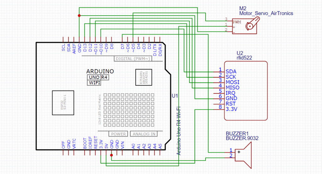 When the system is powered on, the servo motor starts at 30°, which is the closed-door position. The RFID reader and alarm are also ready.