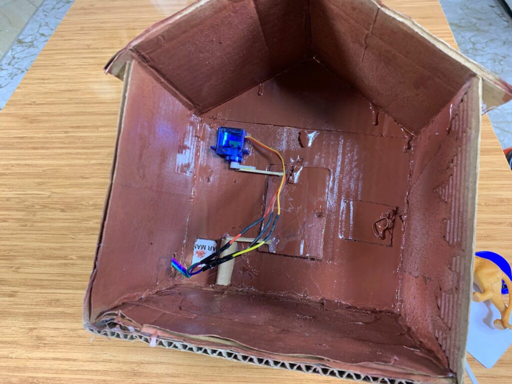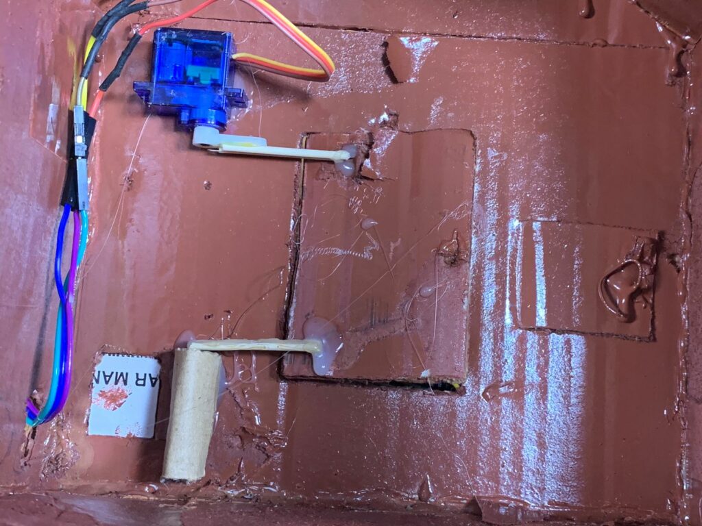 On the top-left side of the door, behind it, I fixed the servo motor. The free ends of the two glued sticks were connected to the top-left corner of the door, allowing it to move when the servo motor rotates to open and close the door.