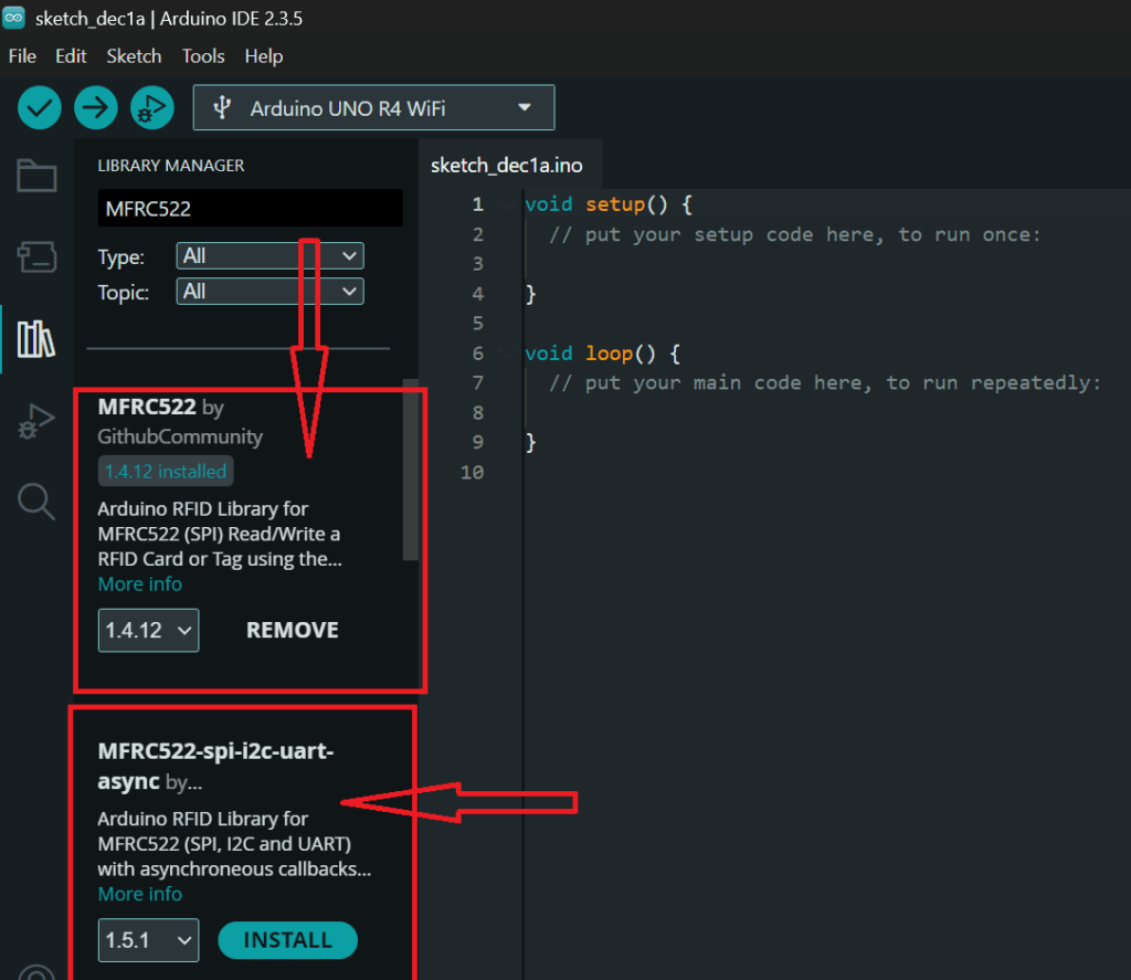In the search bar, type “MFRC522” and look for the library named “MFRC522 by GithubCommunity” or “MFRC522 by Miguel Balboa”.
