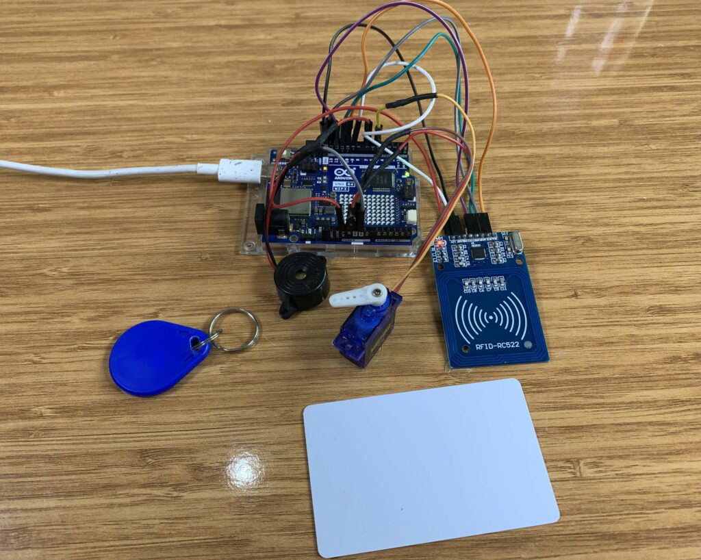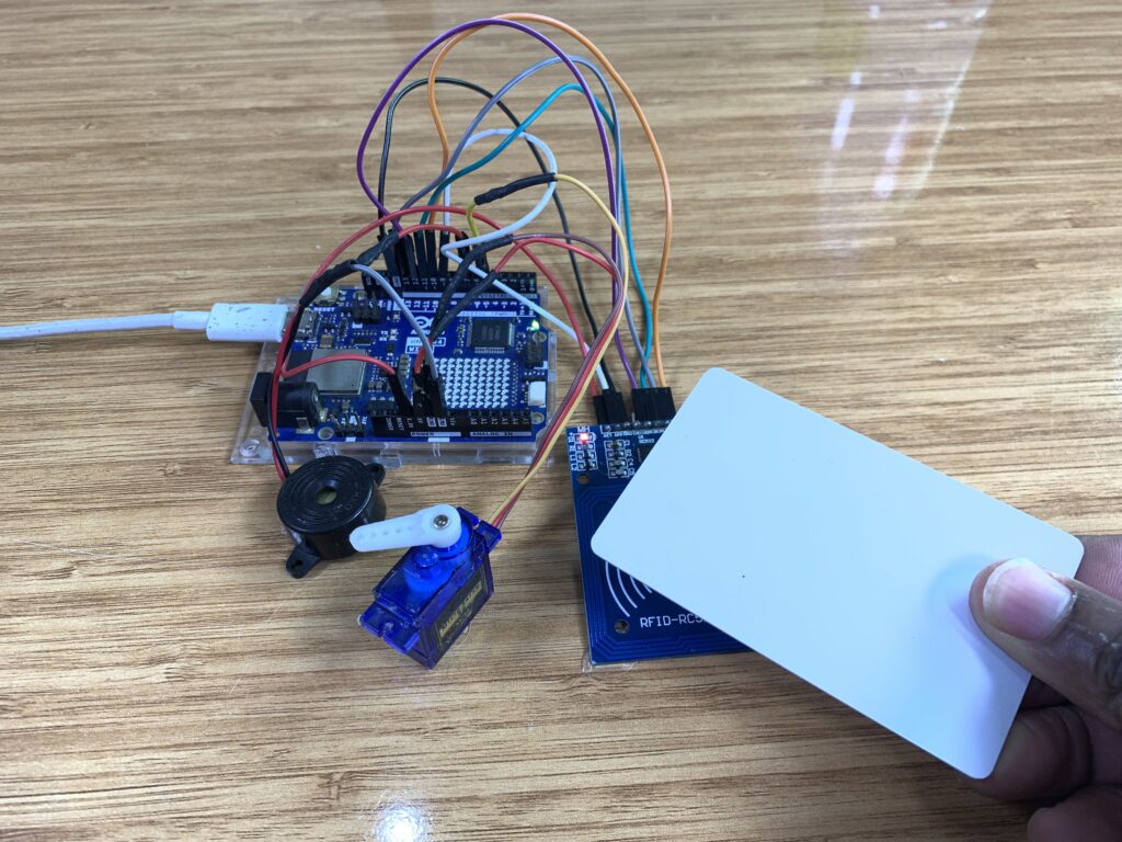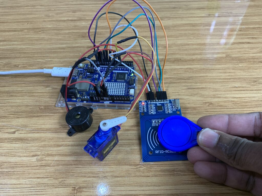 • If an unauthorized card is scanned, the buzzer (alarm) turns on for 2.5 seconds and the servo remains locked.