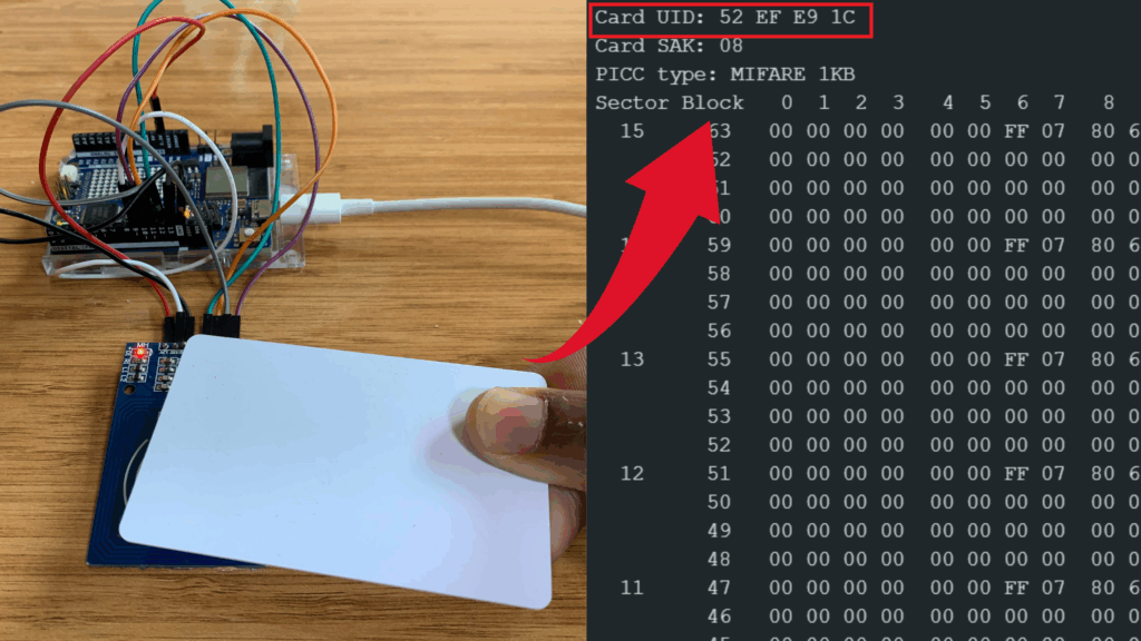 Place an RFID card or tag (also called PICC – Proximity Integrated Circuit Card) near the MFRC522 antenna.