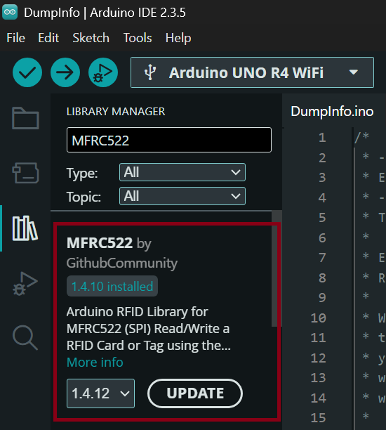 Before using the MFRC522 RFID module, you need to install its library. We recommend using the MFRC522 library by GithubCommunity.